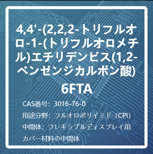 當(dāng)社のフルオロポリイミドモノマーから合成されたPIは良好な機械的特性(高Tg)、高い反応性、高い溶剤溶解性を持っています。フレキシブル?ディスプレイと5G通信材料開発のための重要なモノマーです。フッ素モノマーの改質(zhì)により、ポリイミド材料は低誘電率、透明性、その他の特性を向上させることができます。